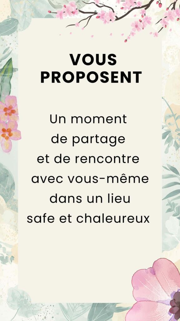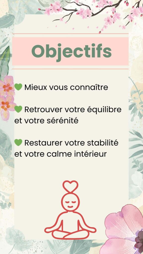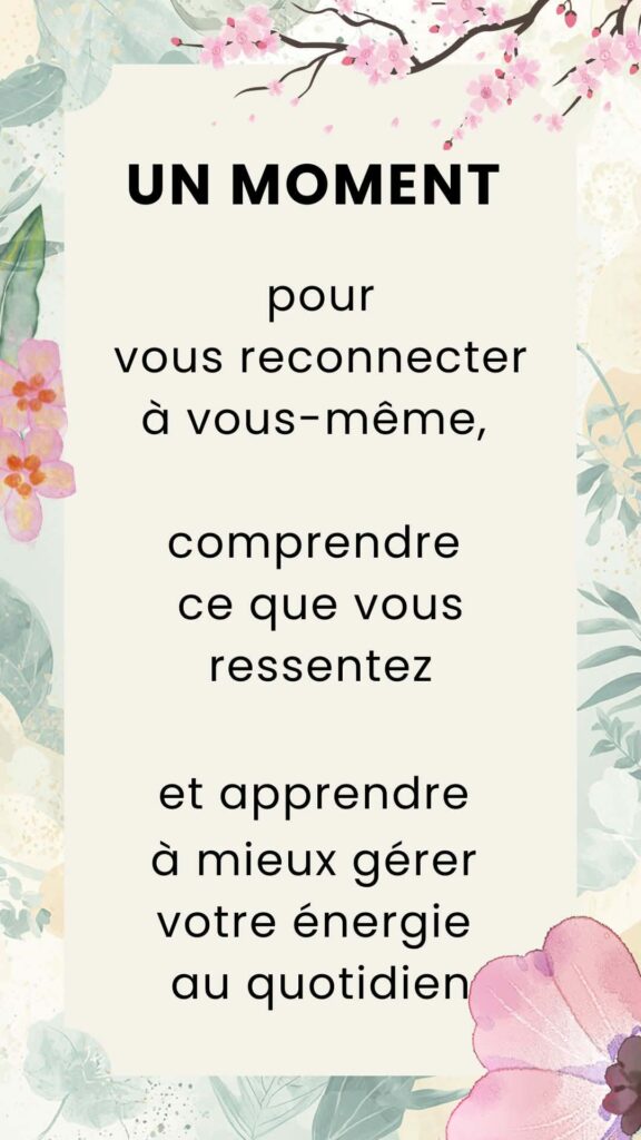 Il s’agit avant tout d’un moment pour vous reconnecter à vous-même, comprendre ce que vous ressentez et apprendre à mieux gérer votre énergie au quotidien.
